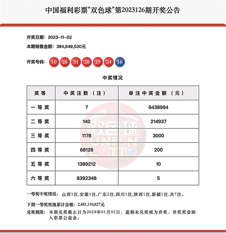 11月2日晚,中国福利彩票双色球游戏第2023126期开奖,本期双色球开奖号码为10 24 26 28 29 31 16。