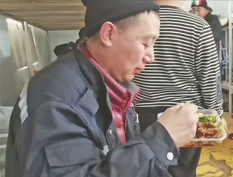 对于迎战本轮降雪的史成良来说,“迟到”的午休是难得的休息。“我们都是人休机不休,这不下午1点多了嘛,我们回单位宿舍吃个饭,也就是10分钟,休息休息,调整一下状态,就又要出发了。”盒饭里的菜,史成良吃得干干净净,收拾好后,他站在宿舍的大门外看着越来越大的雪,眉头紧皱,“我们为什么不间断作业呢,就是希望尽量减少积雪,这雪没有停下来的意思,晚高峰前,我们还要在作业区奋战。”