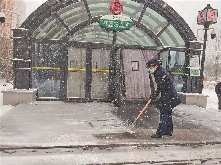 为确保车站清雪工作及时,站内客运组织秩序平稳,支部党员们主动申请到车站加班支援,体育公园站翟梦瑶,不到6点就到站了,和其他员工一起清除冰雪、疏导客流。