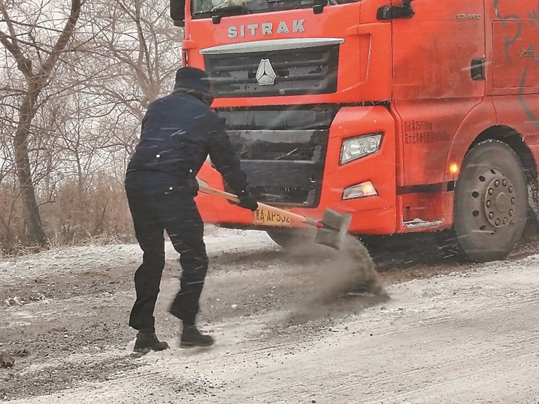 6日上午,在哈红公路谷家大桥坡路,一辆重型货车因雪阻路,无法上坡被困,哈市阿城区公安局交警大队负责清障的警车巡逻至此发现后,交警们立即调铲车拉炉灰来到现场,沿坡顶到坡底撒上炉灰,历时一个小时,终于让货车成功上坡。