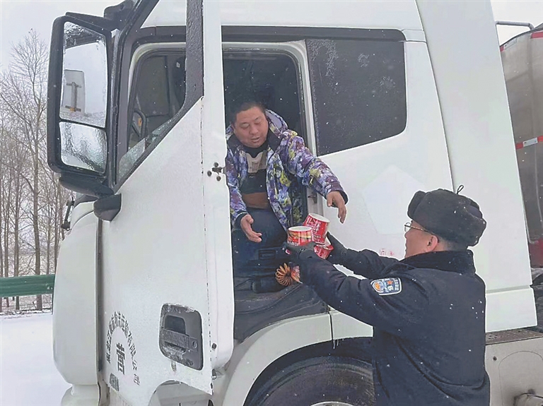 民警顶风冒雪伸援手 帮助推车脱困 给滞留大货车司机送泡面