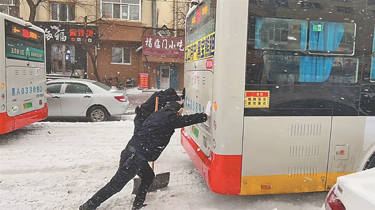 哈市公安局平房分局集结30余名民警、辅警组成应急处突队,救助需要帮助的市民。一辆361路公交车在新平街坡路抛锚,他们立即赶到支援。从早6时许开始,民警陆续救助抛锚车辆30余辆。