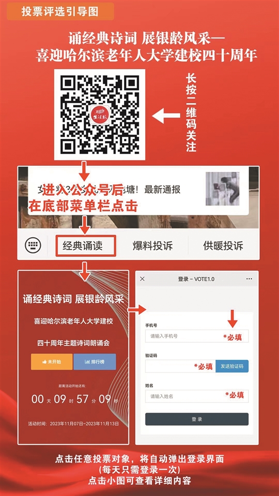 本次评选活动采取网络实名投票方式,参与投票者请关注生活报公众微信号,进入底部菜单栏,点击经典诵读即可参与投票。投票自11月7日7时—11月13日21时结束,每个电话号码每日只能投十票。快来为你的老爸老妈和认识的叔叔阿姨投上宝贵的一票吧,让夕阳更美,让他们的晚年生活更灿烂耀眼。