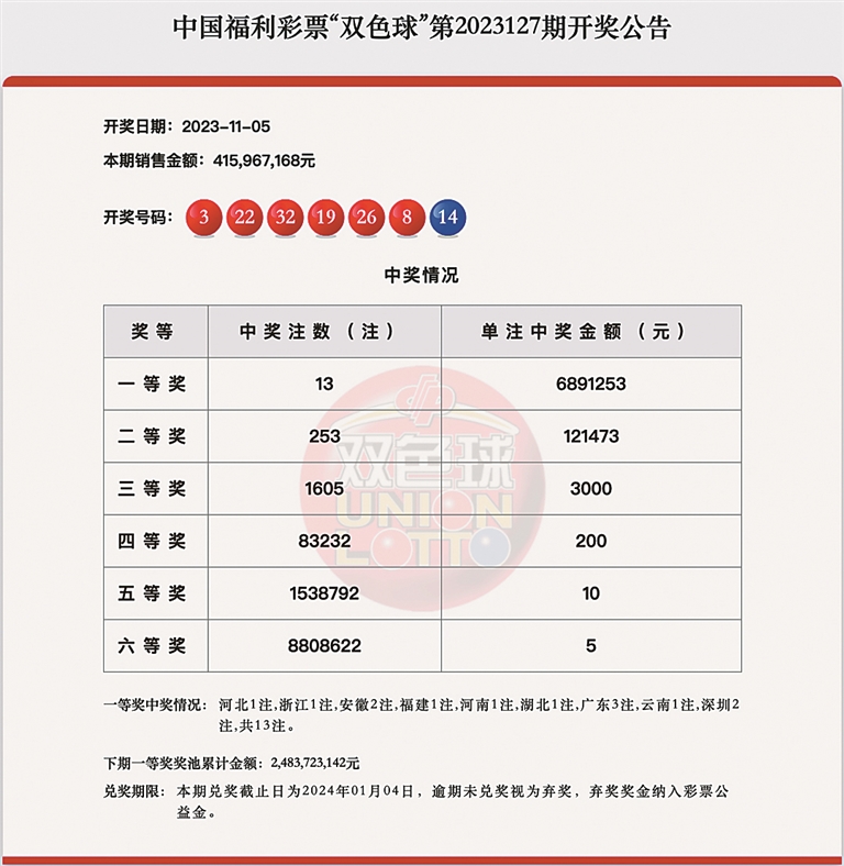 11月5日晚,中国福利彩票双色球游戏第2023127期开奖,本期双色球开奖号码为3 8 19 22 26 32 14。一等奖中出13注,单注奖金为689万余元,中奖情况:河北1注,浙江1注,安徽2注,福建1注,河南1注,湖北1注,广东3注,云南1注,深圳2注;二等奖中出253注,单注奖金为12万余元;六等奖中出880万余注。本期销量4.15亿元,筹集公益金1.49亿元。下期一等奖奖池累计金额24.83亿元。