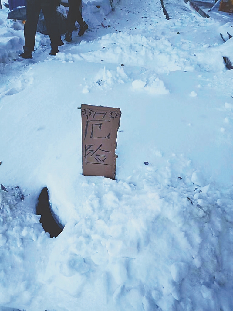 之后,记者也多次拨打井盖上的电话,始终无人接听。7日上午,记者再次来到现场,附近居民张成说:“这两天下了这么大的雪,整条路都被积雪覆盖,这个‘张着嘴’的井盖随时有‘吞人’的风险,希望有关部门尽快给予修缮,防患于未然。”现场记者看到,蛋糕店的店员用纸板写了一个“危险”的警示标志,立在井盖上。“这个警示标志只能起到临时提醒的作用,不是长久之计。”店员刘颖表示。