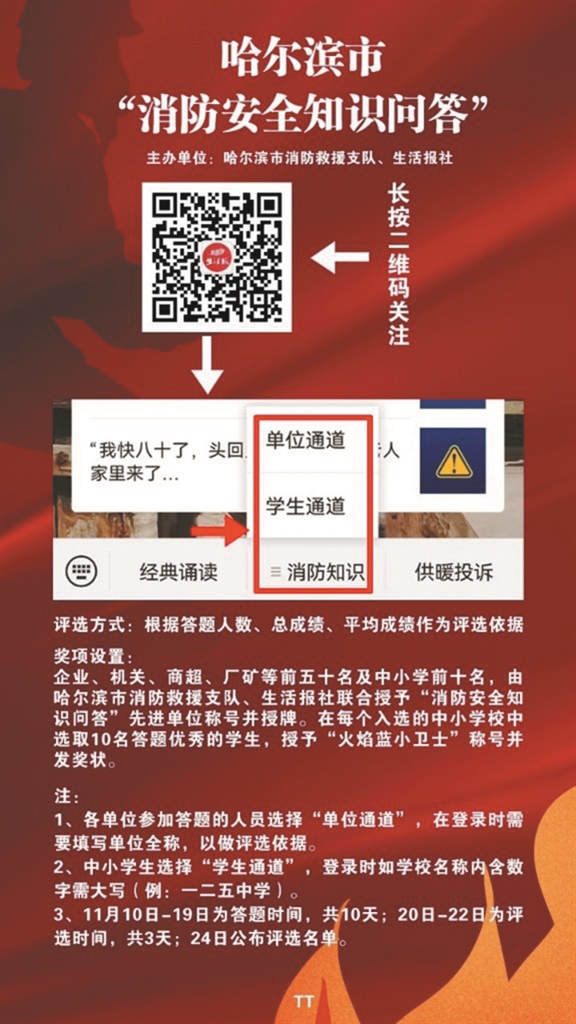 据悉,此次由哈尔滨市消防救援支队、生活报社联合出题,题目共计100道(单选题60道、多选题和判断题各20道)。具体的答题时间为11月10日-19日(共10天);20日-22日为评选时间,共3天;24日公布评选名单。