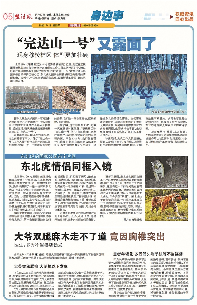 7月份,龙江森工集团穆棱林业局有限公司保护区管理局工作人员,在例行巡护中通过野外红外线相机,再次发现了野生东北虎“完达山一号”,在东北红豆杉国家级自然保护区核心区、东北虎豹国家公园穆棱园区内活动的清晰影像。据东北林业大学国家林草局猫科动物研究中心的赵越博士介绍,视频中出现的东北虎是在今年4月拍摄的,经过比对,确认就是此前在穆棱林区放归的“完达山一号”。从画面中可以看到,它皮毛光亮,比之前壮硕了不少。
