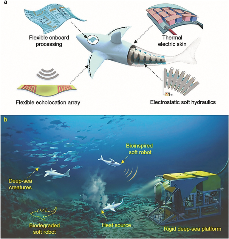 深海机器人作为当前深海探索的重要技术手段,在海底资源探测、极端救援等领域扮演着重要角色。作为水下装备领域的前沿分支,软体水下机器人以软体生物为仿生原型,在结构上,由高度柔软的弹性材料组成;在功能上,由智能软材料代替电机或传感器提供类肌肉驱动或感知。因其特有的强适应、高柔顺、自感知等优势,软体机器人已在深海领域应用中展现出极大潜力。