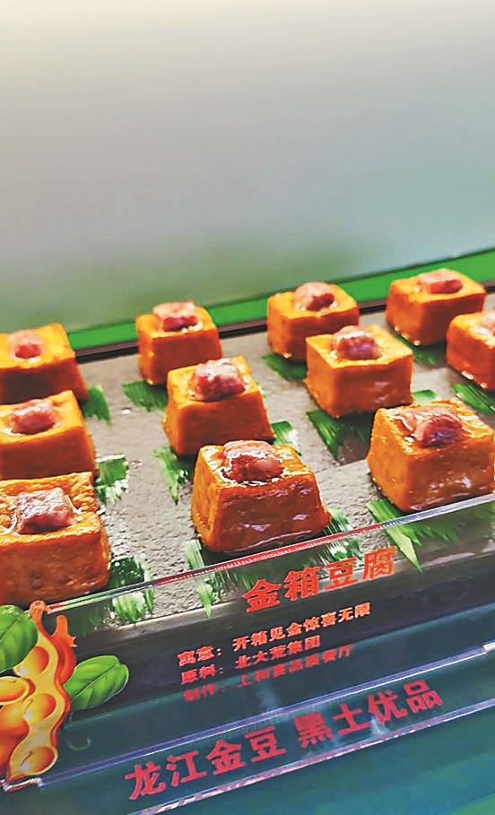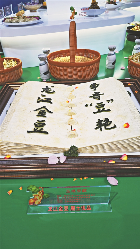 据介绍,百豆宴又名争奇“豆”艳·冰城百豆宴,是以哈尔滨地区优质大豆为原材料制作的百道精美菜系,从营销链、品牌链、价值链到产业链,系统化展示了哈尔滨优质大豆的营养价值、核心价值的全产业链现状。展示区设计了一幅巨型玉书豆腐,“争奇豆艳”四字用彩色蔬菜雕刻,图说大豆产业的高质量发展之路。
