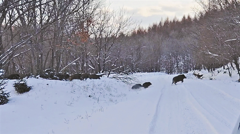 生活报讯 (记者王萌) 11月12日上午,东宁市通沟岭的一条通乡公路上,市民偶然间拍到野猪成群结队出现,先是一只野猪快速跑过通乡公路,紧接着一群野猪跟着跑了过去。