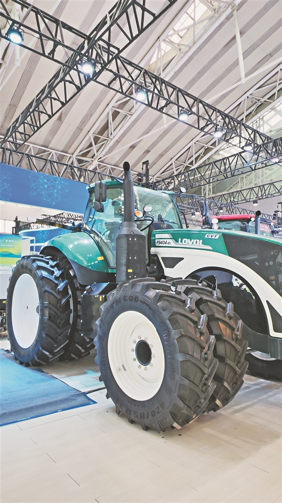 在农机展示区,一台3米多高的大型拖拉机以“一览众山小”的气势,成为展区内的最高点,也成为众多逛展市民争先合影的明星展品。
