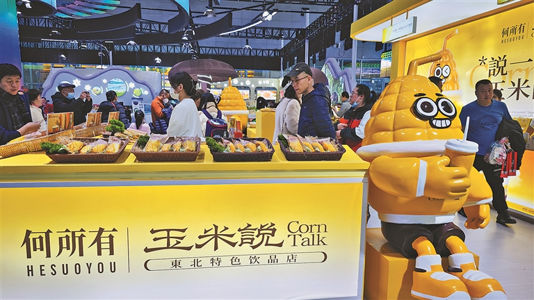 在B区的哈尔滨展厅,一处风格清新的展区内逛展者络绎不绝,大家纷纷驻足观看,品尝,最后拎着大包小裹离开的不在少数。从展区的色调和一个摆放的黄色玉米造型的大玩偶不难猜到,这里的展品一定是以玉米为主。
