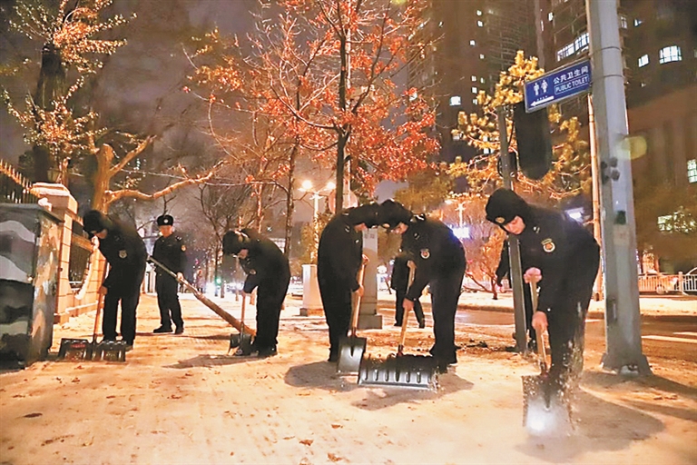 生活报讯 (记者李丹) 16日,哈尔滨市再度迎来降雪天气,为给学生们创造安全的通行秩序,全市各区城管执法队员陆续到各中小学周边清理积雪。