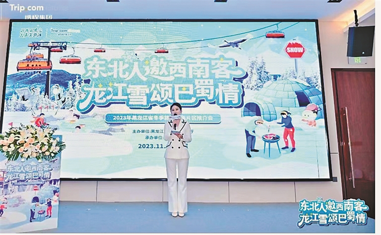 哈尔滨市文旅推介官介绍了今冬推出的“冰雪旅游、冰雪文化、冰雪艺术、冰雪时尚、冰雪体育、冰雪经贸”七大板块活动,诚邀巴蜀游客到“冰城”体验全球超长冰滑梯、观赏“海洋之心”表演、遇见“淘学”企鹅、感受极致滑雪的激情。