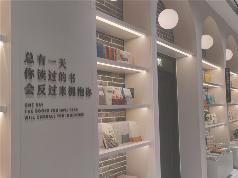 从二楼到六楼,墙上能看到很多与阅读有关的小句子:“总有一天你读过的书会反过来拥抱你”“每一本书都如一泓溪流”“看书的人是超越时间的同行者”……每一句都很温暖、励志。尤其是在六楼文化教育馆,展陈、出售的是教辅书籍,工作人员十分“应景”地挂上了“未来可期”的书法,足见其用心。另外,时下最流行的“XXX在这里等你”网红语,也出现在了书店一角。