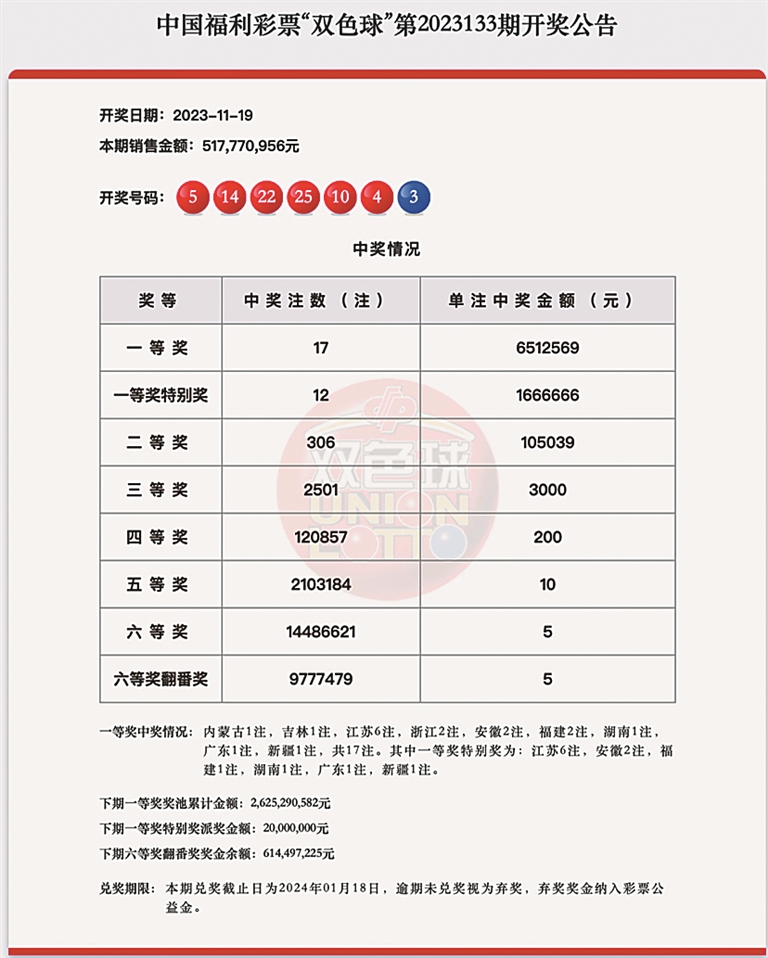11月19日晚,中国福利彩票双色球游戏第2023133期开奖,本期双色球开奖号码为4 5 10 14 22 25 3。