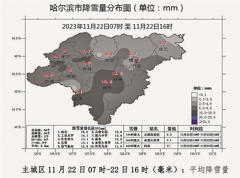 记者从哈市气象台获悉,22日7时-16时(毫米):此次降雪从22日7时前后开始,五常为雨转雨夹雪转雪,其他区域为雪。18个站降暴雪,前五位为尚志15.2、工业大学14.1、东北农大13.1、五常13.1、省气象台12.9;28个站降大雪,前五位为体育公园9.9、黑龙江大学9.6、群力丁香公园9.5、枫叶园林公司9.5、水利研究院9.5;6个站降中雪;其余均为小雪。