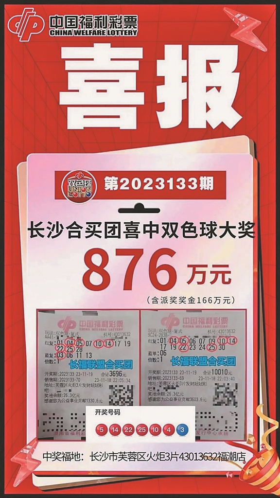 11月19日晚,中国福利彩票双色球开奖,开出红球号码为04、05、10、14、22、25;蓝球号码为03。全国一等奖井喷中出17注,单注奖金651万余元,一等奖特别奖井喷中出12注,单注加奖奖金166万余元。其中1注一等奖喜降长沙市,中奖地位于芙蓉区火炬北3片43013632销售网点。这也是本次双色球12亿派奖期间,长沙彩市连续三期接连斩获的双色球头奖。