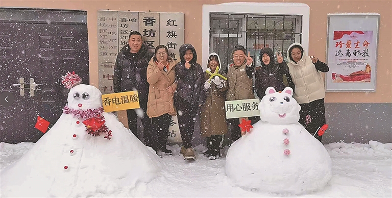 在香电社区,居民们滚雪球、运雪、摆造型,一个个形态迥异、憨态可掬的雪人出现在小区各处,大家认真堆雪,忙得不亦乐乎。