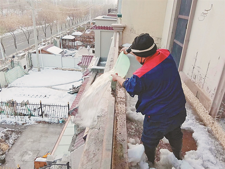 “经过进一步排查,我们发现之前雨排管被冻住,导致冰水混合物堆积。”王学书告诉记者,当时李女士一个人在家,便让李女士拿来塑料盆,他俩轮流站到30厘米深的冰水里舀水,并排到李女士自家院子里,“刚开始时,穿的靴子几乎与水面持平,冰水会进入靴子内,我俩边舀水边清理靴子里的冰水,当时真有那种刺骨的感觉。”两人轮流舀了近两小时,将露台积水清理完毕后,又帮李女士疏通了雨排管,此时,两人的手脚已经出现红肿的迹象,李女士一再感谢。两位师傅清理完毕后就返回了工作岗位,又参加园区的清雪工作,直到李女士向项目部表达感谢之情时,大家才知道两位师傅默默做了这些工作。