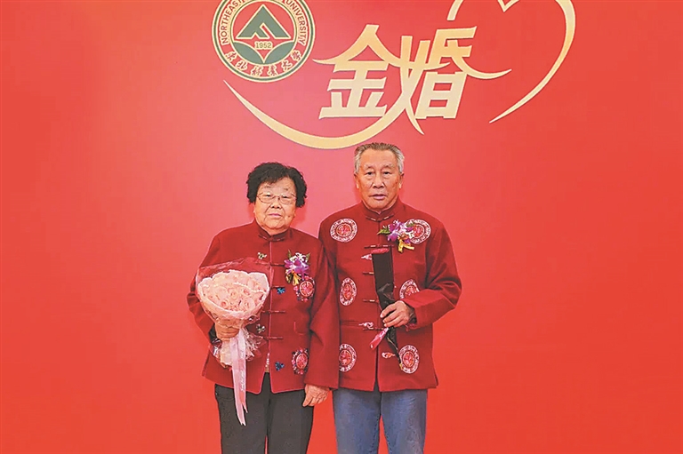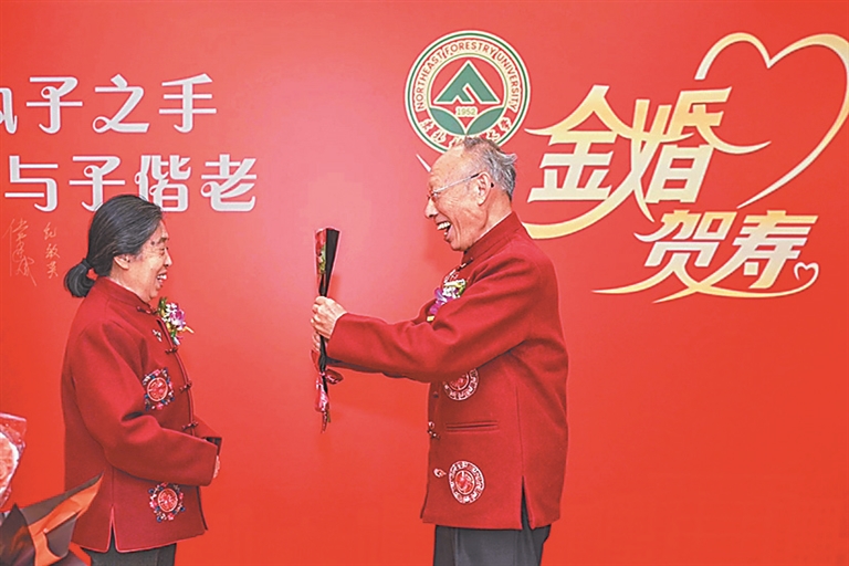 红地毯、签名墙、彩色气球、节日条幅、浪漫音乐、鲜花蛋糕……近日,东北林业大学(以下简称东北林大)第四届“金婚暨贺寿”庆典以线上线下相结合的方式举行,为79对金婚伉俪和长寿老人送去祝福。