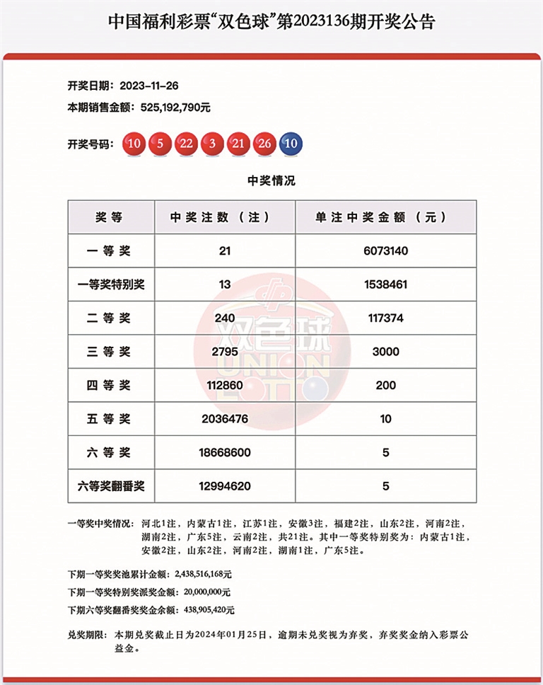 11月26日晚,中国福利彩票双色球游戏第2023136期开奖。本期双色球开奖号码为:3、5、10、21、22、26、10。一等奖中出21注,单注奖金为607万余元。中奖情况:河北1注、内蒙古1注、江苏1注、安徽3注、福建2注、山东2注、河南2注、湖南2注、广东5注、云南2注。其中,一等奖特别奖为:内蒙古1注、安徽2注、山东2注、河南2注、湖南1注、广东5注。二等奖中出240注,单注奖金为11万余元。六等奖中出1866万余注。