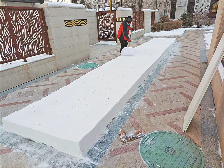 “咔咔嚓嚓……”日前,记者走进欣汇龙物业服务的汇龙半岛首府小区时,物业“环境美容师们”正利用自制的修雪型工具,对积雪进行拉线齐边,将表面修整光滑,塑造成美观整洁、醒目有型的方方正正的雪堆。