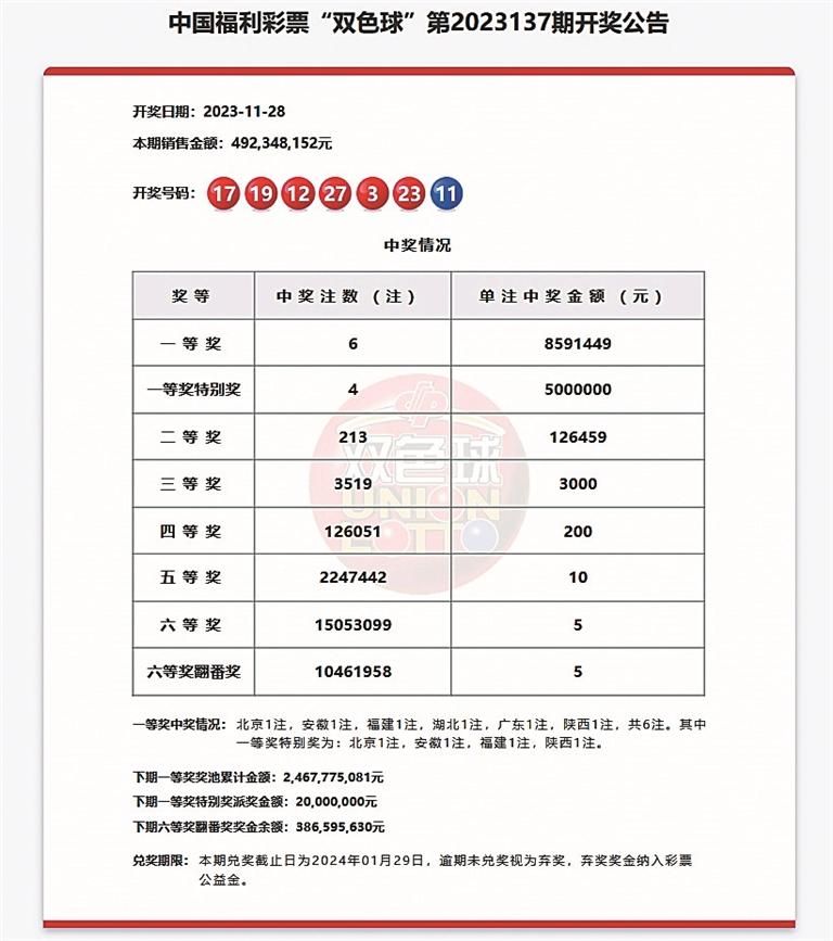 11月28日晚,中国福利彩票双色球游戏第2023137期开奖。本期双色球开奖号码为3 12 17 19 23 27 11。一等奖中出6注,单注奖金为859万余元,中奖情况:北京1注,安徽1注,福建1注,湖北1注,广东1注,陕西1注。其中一等奖特别奖为:北京1注,安徽1注,福建1注,陕西1注。二等奖中出213注,单注奖金为12万余元。六等奖中出1505万余注。本期销量4.92亿元,筹集公益金1.77亿元。下期一等奖奖池累计金额24.67亿元,下期一等奖特别奖派奖金额2000万元。