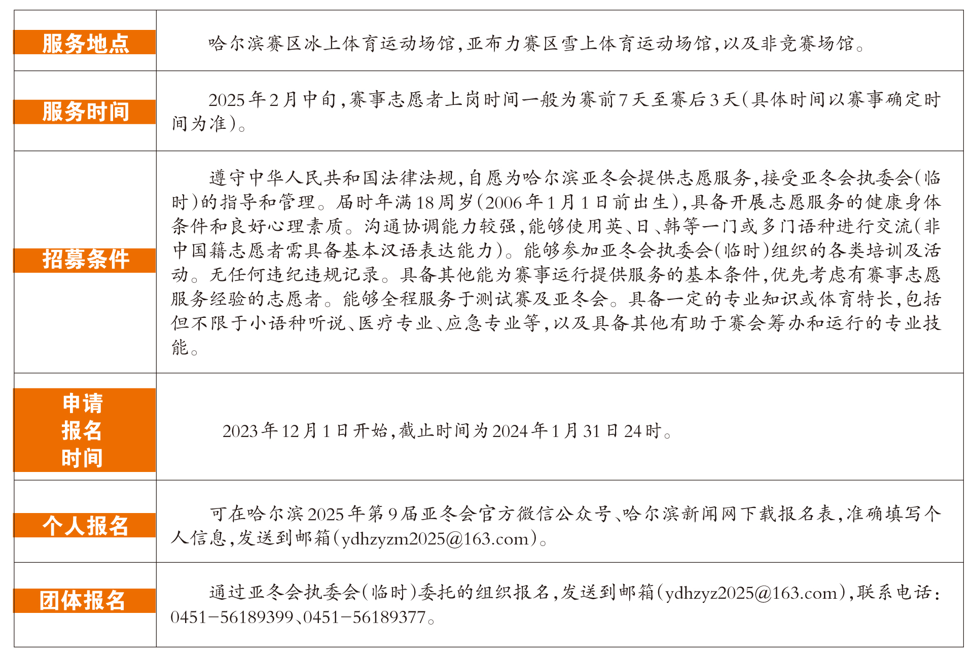 生活报讯 (记者张立) 记者近日获悉,为深入践行“精彩、圆满、绿色、廉洁”的办赛理念,广泛汇聚重点领域的志愿力量,举办一届具有“亚洲风采、中国气派、龙江特色、冰城魅力”的体育盛会,哈尔滨2025年第9届亚冬会执委会(临时)决定,启动赛事志愿者招募工作。