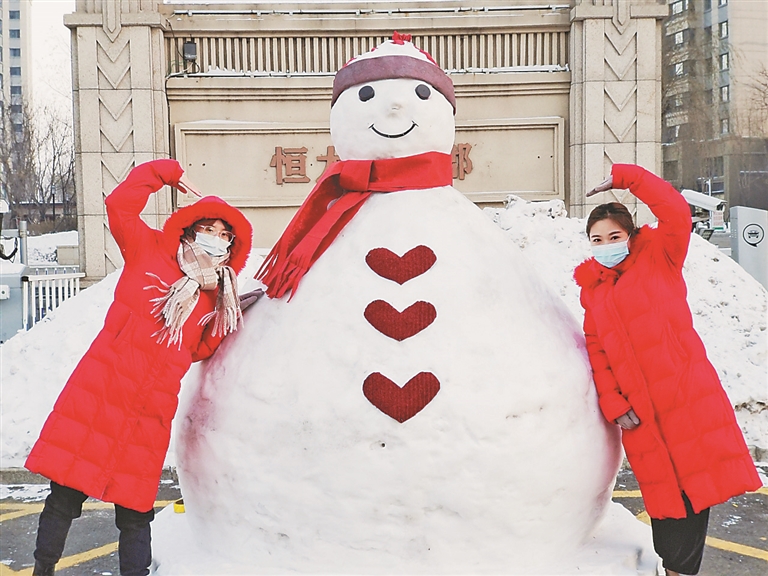 日前,记者来到恒大名都小区,进入正门首先映入眼帘的是一个一人多高的大雪人,它肩披红色围脖、头戴防寒帽,还有3枚心形衣扣,造型憨态可掬,路过的业主不时驻足拍照。