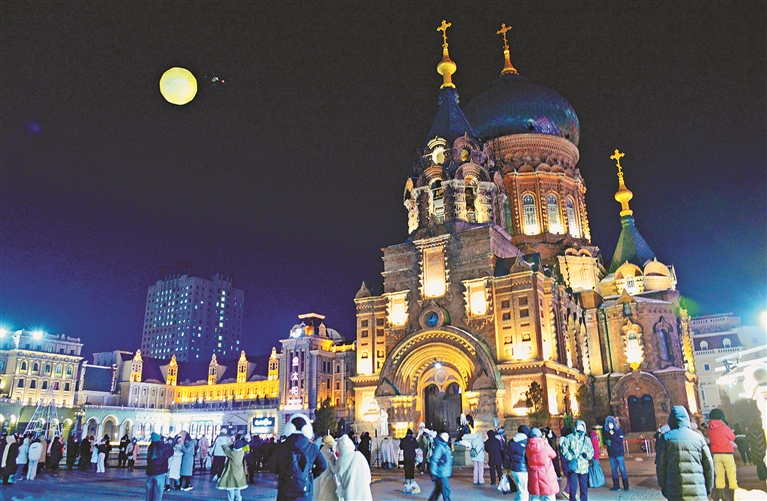 在现场,一对从深圳到哈尔滨看雪和冬景的小姐妹“东东”和“西西”告诉记者,她们第一天到哈尔滨就来索菲亚了,听说索菲亚特别美、建筑非常有特点,看了之后感觉果真不虚此行。“最让我们惊喜的是,之前并不知道这里会升起一轮‘明月’,这个‘硕大的月亮’与周围的建筑、灯光融为一体,感觉太美啦!”“这轮‘明月’太让我欣喜了,它非常适合拍照、打卡。”四川游客王女士说,她白天和夜晚都来打卡了索菲亚广场,“我还准备在这里旅拍一组写真,给此行留下最唯美浪漫的色彩。”