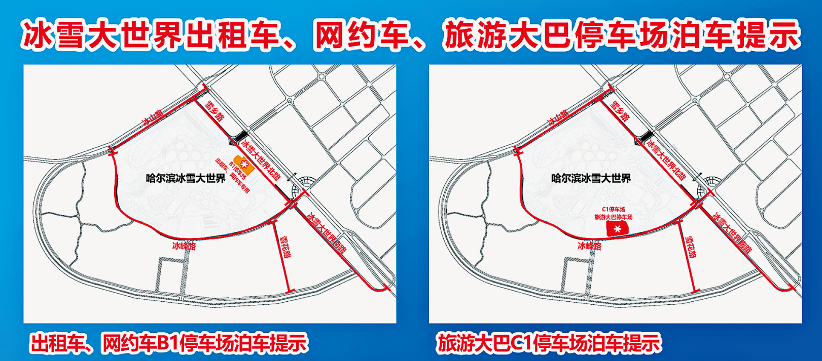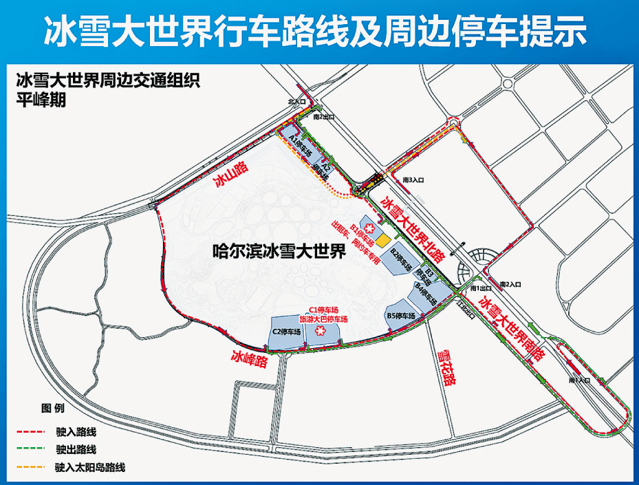 江南方向进场:公路大桥-桥下环路-冰雪大世界路-冰花路-雪花路-冰峰路-进入B区停车场。