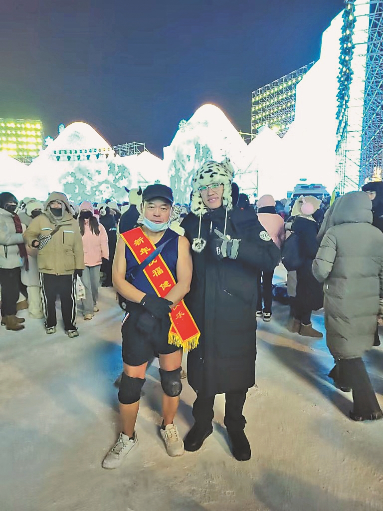 生活报讯 (记者王晓晨) 前几日,南方“‘短袖哥’勇闯冰雪大世界”的短视频冲上热搜。一时间,“南方人成功‘挑战’东北气温”“南方人比东北人不怕冷实锤”等话题引起网络热议。我省的耐寒奇人也不甘示弱,2023年12月31日晚,68岁的金松浩来到冰雪大世界,穿着背心、短裤逛冰雪景观、与游人互动。