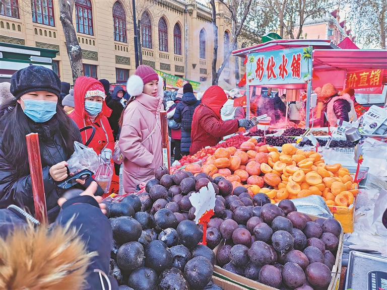 “嘎嘎甜的冻梨、冻柿子、冻草莓……”进入早市,满眼都是“独具特色”的游客们,戴着各种卡通造型帽子、穿着浅色羽绒服,走到哪里都倍感兴奋、惊呼不断。来自成都的游客关航刚买了冻梨,拿出来“吭哧”就是一口,笑得摊主付大姐连忙抢下来,给放了个新的在兜里。“这梨、柿子得回去化软了吃,这冻得杠杠的,不把门牙磕掉了。”对于大姐的热情,关航和小伙伴也是伸出大拇指点赞。付大姐告诉记者,她在早市卖冻货七八年了,属今年最火,游客特别多,“现在每天卖得比往年多一倍,我这冻货品种也增多了,在传统的冻梨、冻柿子、冻草莓、冻黄桃之外,还新增了桑葚、树莓等冻货新品种。没见过的,我都先让免费尝。”