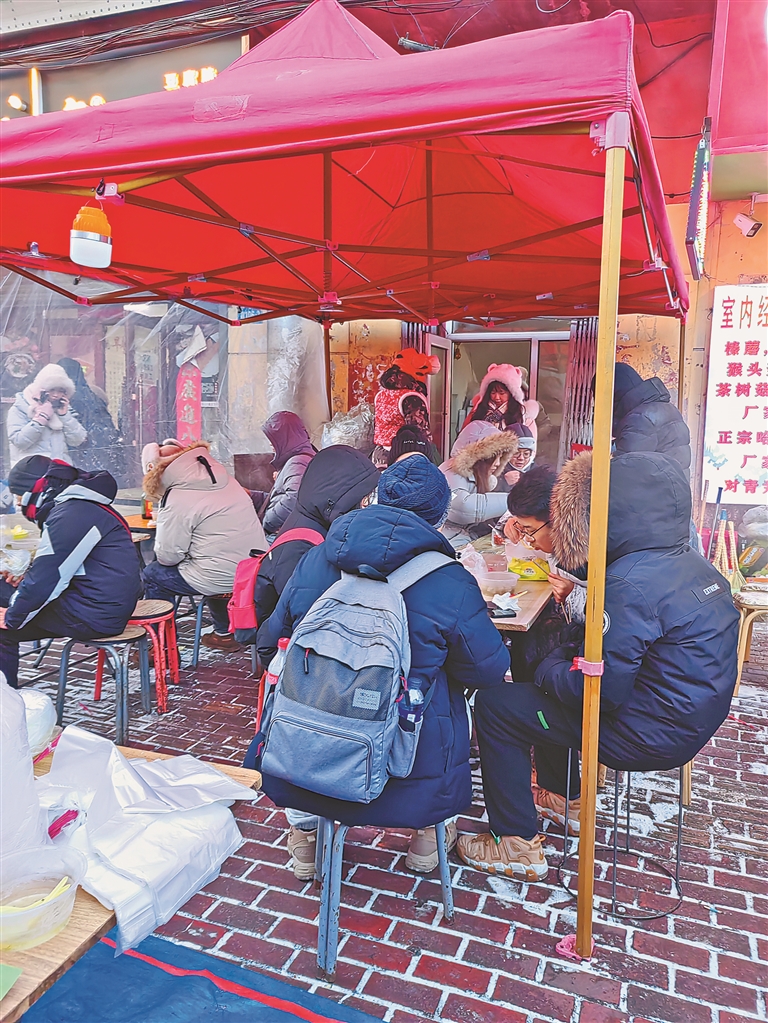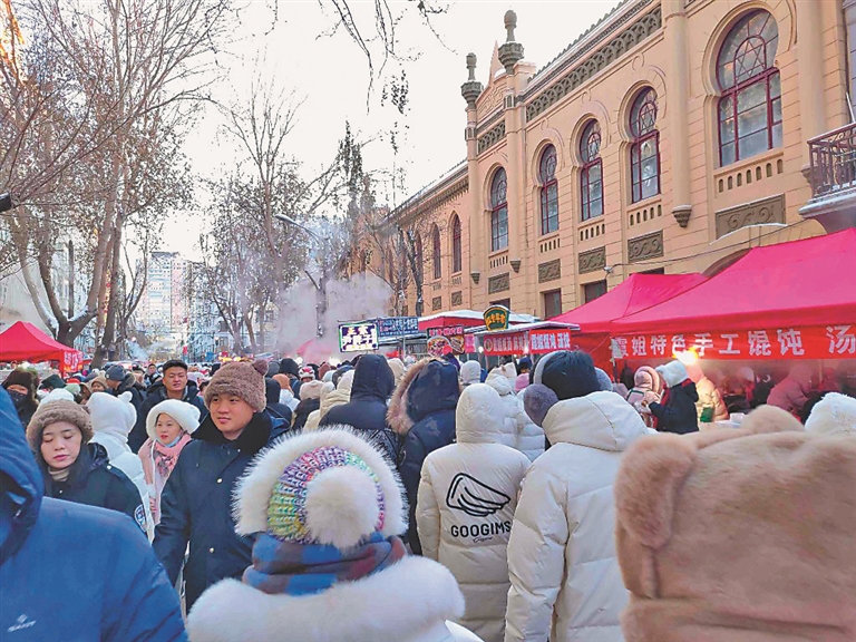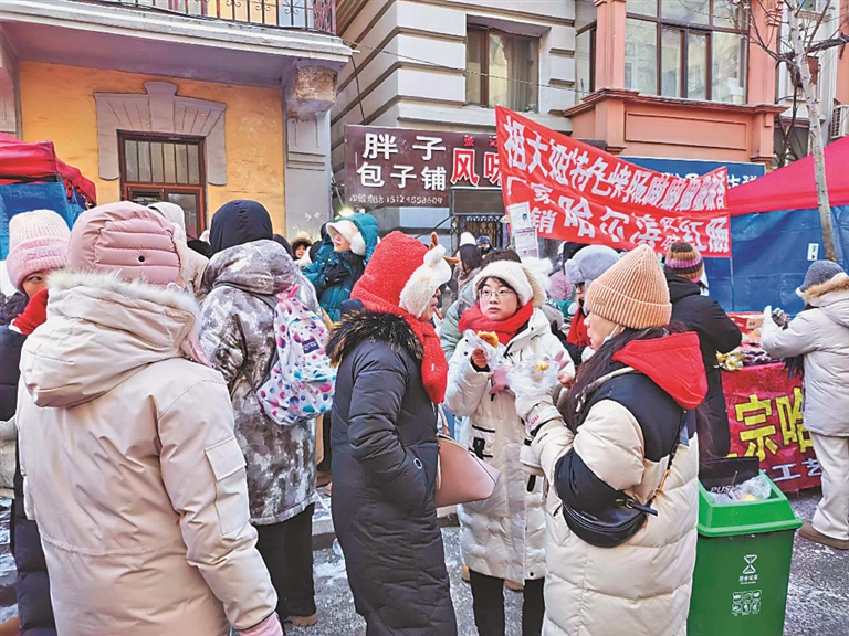 “来之前做了攻略,就想吃这个油条,排队也真是值,太好吃了。”新疆游客程丽拽下围脖,对着买到手的巧克力油条就是一口,格外满足。现场记者看到,蛋堡、包子、油炸糕、粘豆包、奶茶、锅包肉……早市上烟火升腾的摊位都挤满了人。“太实惠、太好吃了,人太热情了。”“粘豆包还送了我一个,先尝。”“哈尔滨人可热情了,卖东西的都叫我们公主、王子”……采访中,游客们对哈尔滨竖起大拇指。