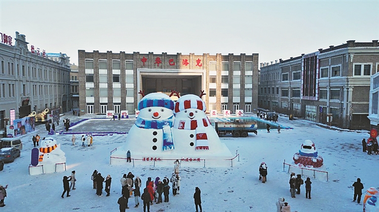 生活报讯 (记者史天一 文/摄) 高8.5米的连体双雪人、穿花袄的滑雪小将、戴蓝色帽的4个大学生雪人……近日,哈尔滨市道外区中华巴洛克历史文化街区前广场,依托朋友、学生、家庭等相应雪人角色进行雪雕布景的“雪人群落”落成,16个造型各异的“雪人大套娃”成为备受游客喜欢的打卡地。