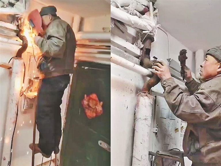 几天前,哈投集团香坊供热公司第二运营部陆续接到五叙街39号5单元多名热用户的报修电话,反映家中暖气不热,温度低。第二维修组组长郭海涛迅速带领维修工杨纪峰、网格员孔德林一同到现场进行查看,经过多单元对比、逐户检查,发现该单元3楼以上用户家温度明显低于其他单元温度,怀疑是三楼楼道内主管线堵塞。维修人员用红外线测温枪沿着主管线逐段进行测温,最后在3楼主管线发现进水管弯头前后温差过大,判断此处弯头严重堵塞导致不热。