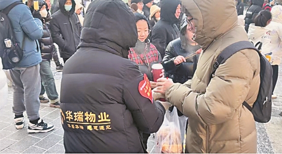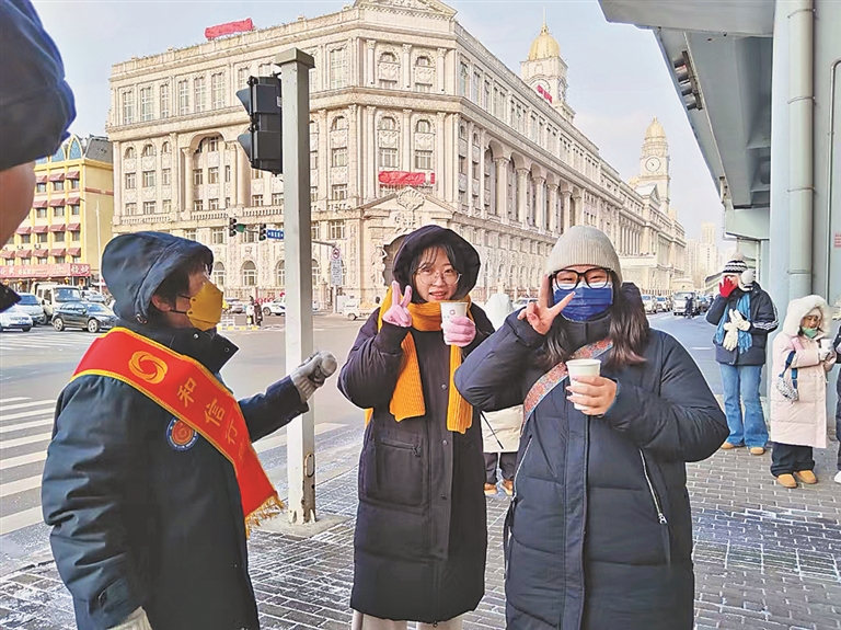 生活报讯 (记者仲亮 文/摄)5日,为了用更加饱满的热情欢迎四海宾朋的到来,冰城物业人在“网红打卡地”,为游客们免费送上了热果珍、热姜茶、小暖贴等御寒用品。