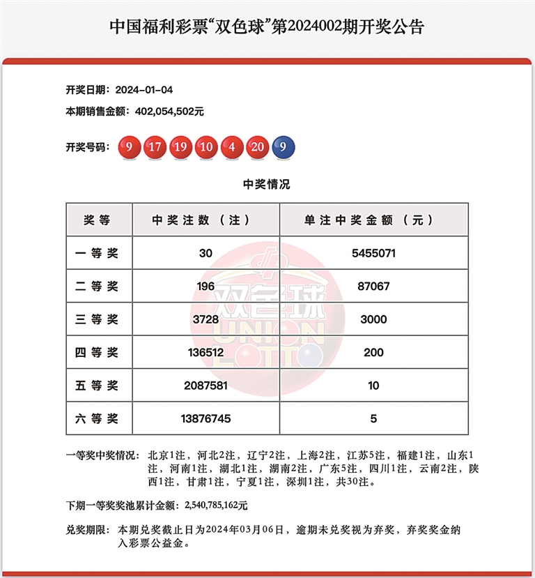 1月4日晚,中国福利彩票双色球游戏第2024002期开奖。本期双色球开奖号码为:4、9、10、17、19、20、9。一等奖中出30注,单注奖金为545万余元,中奖情况:北京1注、河北2注、辽宁2注、上海2注、江苏5注、福建1注、山东1注、河南1注、湖北1注、湖南2注、广东5注、四川1注、云南2注、陕西1注、甘肃1注、宁夏1注、深圳1注。二等奖中出196注,单注奖金为8万余元。六等奖中出1387万余注。