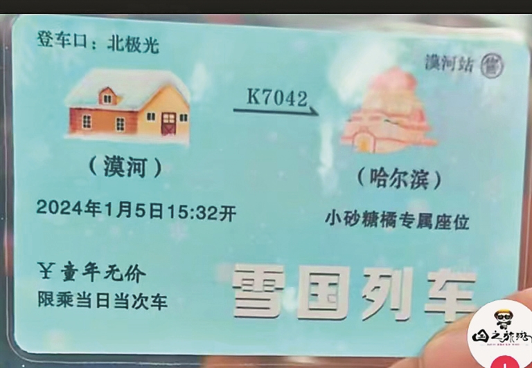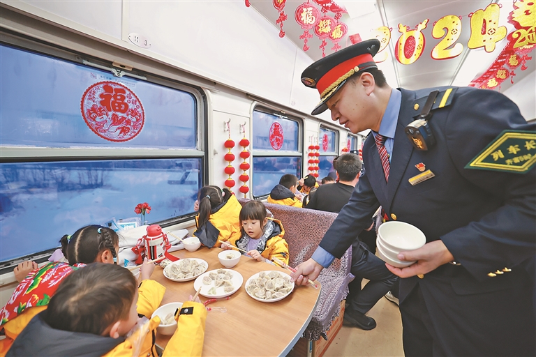 记者从铁路部门了解到,结束漠河研学的“小砂糖橘”们由专人护送前往漠河火车站,踏上了返哈的旅程。漠河-哈尔滨K7042次列车长张勇介绍:“我们提前将餐车布置成了具有东北民俗文化特色的车厢,还准备了定制车票和玩偶等铁路文创纪念品送给孩子们。餐车还特意安排了包饺子的环节,让孩子们在车上吃到自己亲手做的热饺子。”