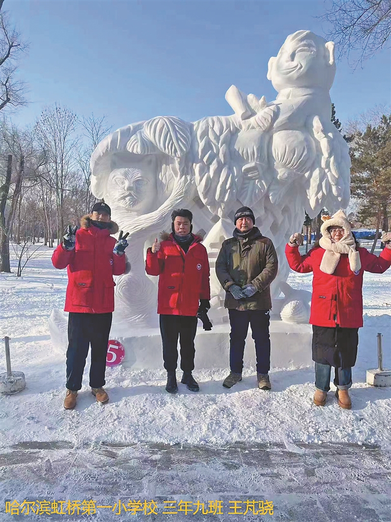 这是第九届黑龙江省大学生雪雕比赛现场,东北农业大学的作品《岁稔年丰》,寓意庄稼成熟、农业大丰收。