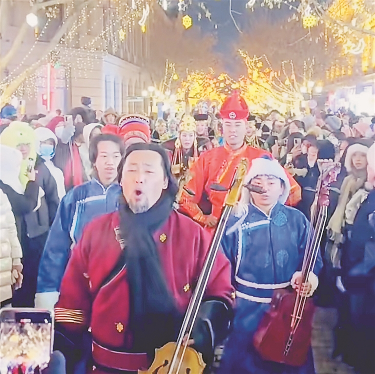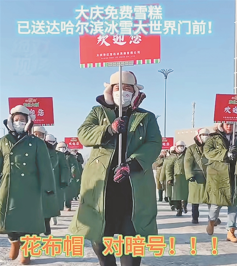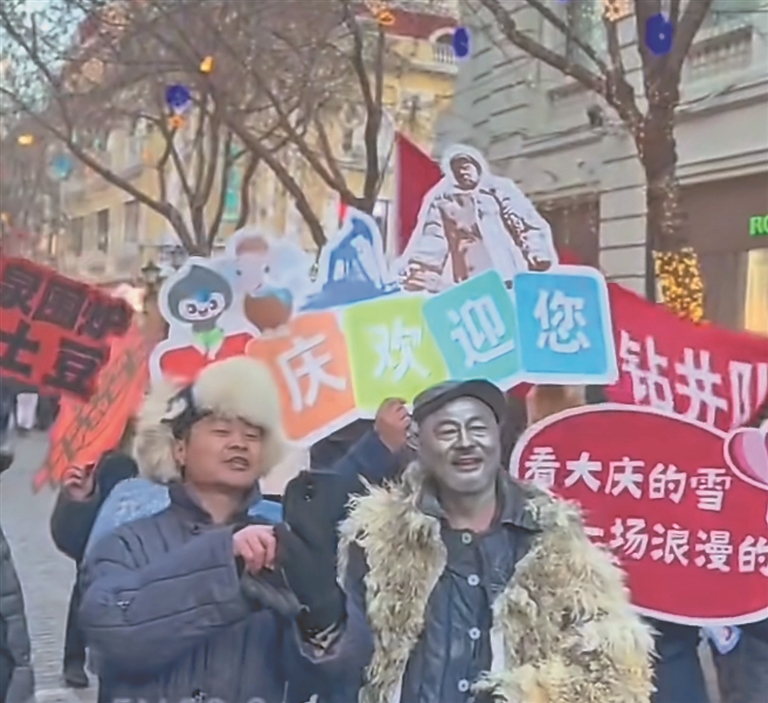 7日,大庆市杜尔伯特蒙古族自治县的蒙古族同胞们,身着盛装来到中央大街,拉起了马头琴,唱起了民族歌曲。大庆1205钻井队的工人们,拉起横幅,唱起豪迈的歌曲,为家乡卖力宣传。同时,大庆市红宝石冰淇淋有限公司带着满满的诚意,10万只“东北大板”送到冰雪大世界,让游客免费品尝。