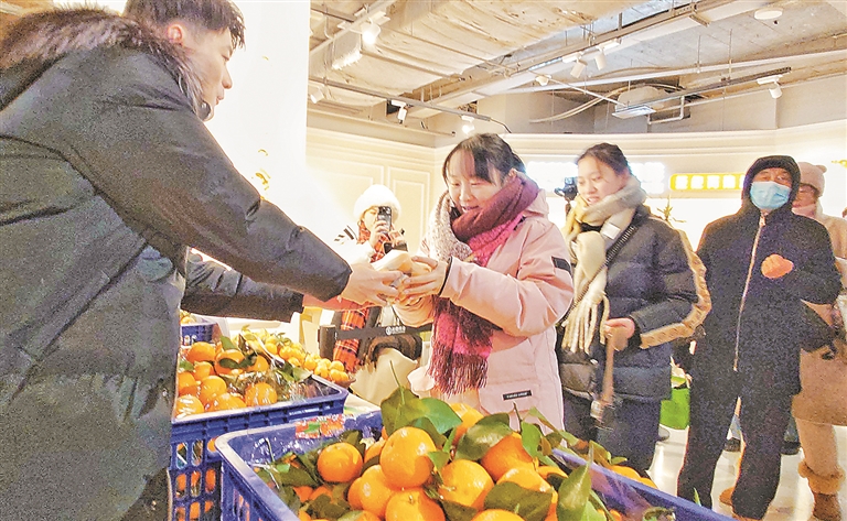 生活报讯 (记者梁晨 文/摄) 11名广西“小砂糖橘”刚离开哈尔滨,来自广西的11车40万斤新鲜水果就于8日一早抵达冰城,免费发放砂糖橘和沃柑的系列活动也于同日启动。