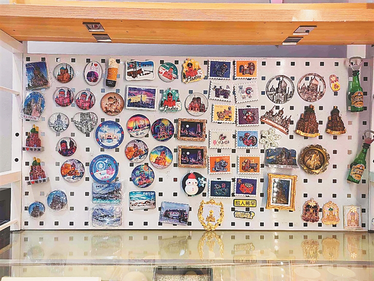 在索菲亚教堂广场游客中心,教堂摆件、丁香花香薰、咖啡杯等纪念品非常受欢迎。在中央大街附近的街边店铺里,文创纪念品也备受青睐,一名河南女孩买了一枚雪花胸针,她表示:“这样的文创纪念品太有意义了,优雅别致,能体现出哈尔滨的特色,特别是一些具有欧陆风情的产品,回去送朋友太有面子了,像出国了一样。”