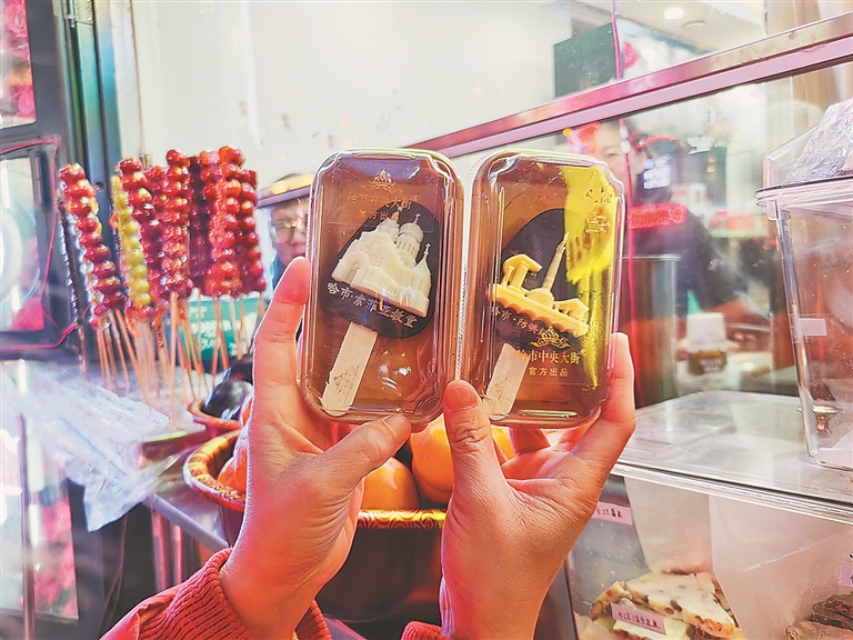 烟囱冰激凌、防洪纪念塔雪糕……除了蛋糕和咖啡外,在中央大街、太阳岛、防洪纪念塔等景点周边的一些小店里,推出了多款带有哈尔滨字样和标志性建筑造型的冰激凌和冷饮,设计时尚新潮,不少游客赞许道:“冰城的文创食品好吃更有文艺范儿。”