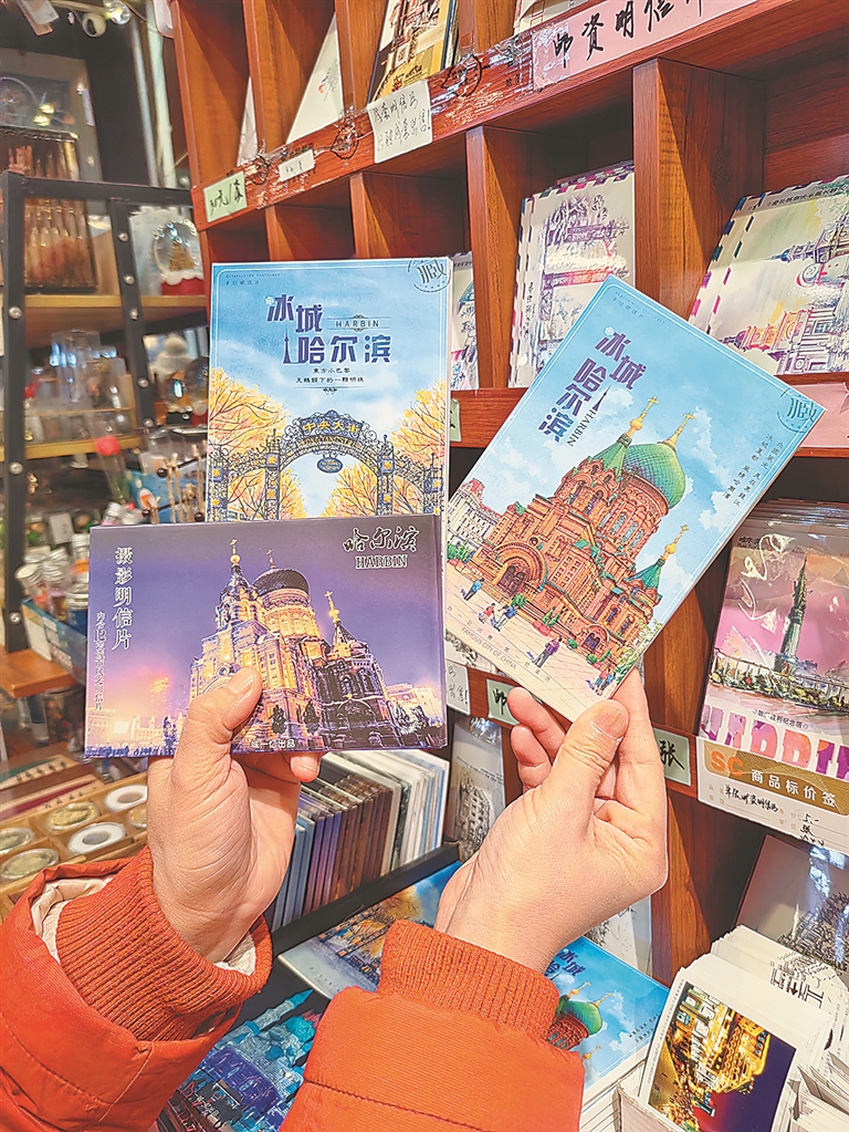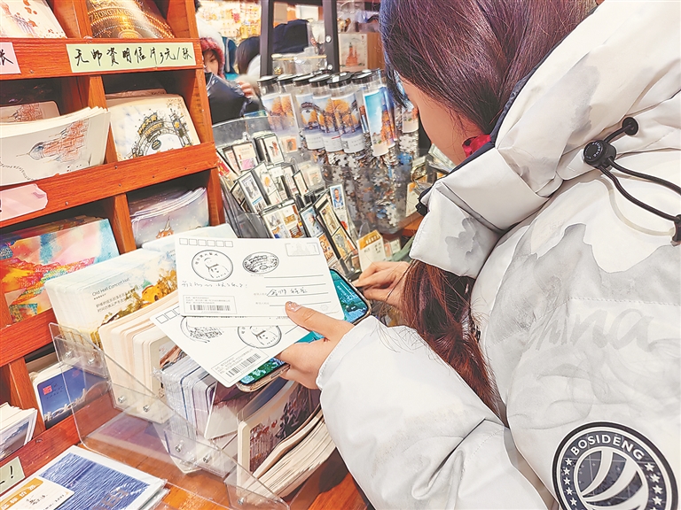 在网络时代,来哈的游客依然能够感受邮寄明信片的“复古体验”。坐落在中央大街的主题邮局现已成为众多游客流连忘返的地方,傍晚时分邮局里仍挤满了购买明信片的游客。带有哈尔滨标志建筑、著名景点、冰雪景观、历史建筑等元素的明信片让人爱不释手,售价3元一张,也可成套购买,有的游客一买就是几十张。“昨天人多没买上,今天特意来买,并邮寄出去了,这里的明信片盖上印章特别有设计感,我想让朋友们通过明信片感受哈尔滨的美。”四川成都的一位游客告诉记者。