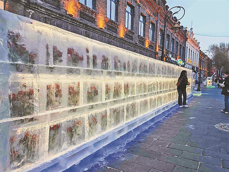 9日,记者来到位于道外区南三道街老道外大戏台附近看到,一束束红色玫瑰镶嵌其中,散发出别样的浪漫气息。在玫瑰冰墙周边,还有心形“冰花墙”也美不胜收,它们的组合为中华巴洛克再添一抹亮色,游客也都在冰墙前合影。