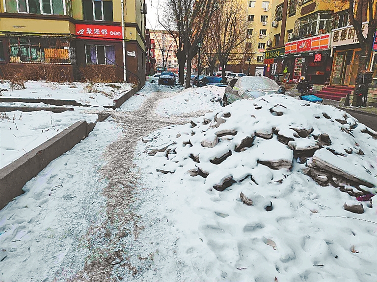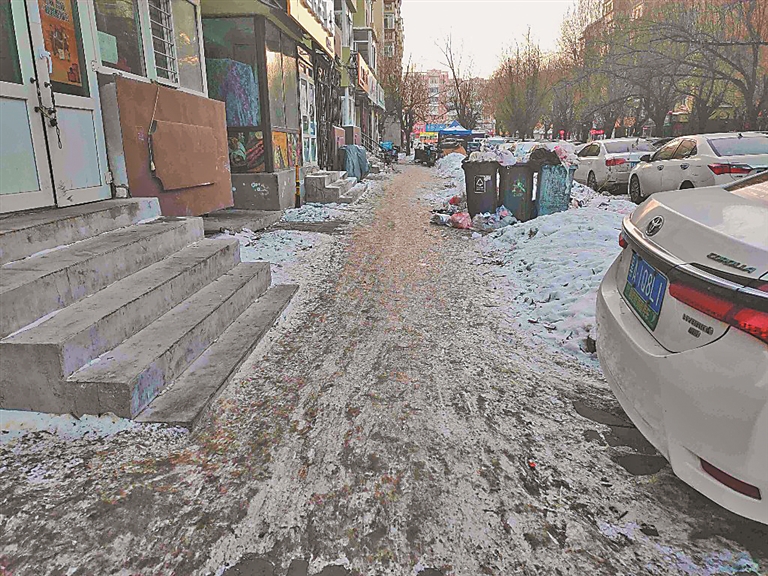 生活报讯 (帮办记者李威兵 文/摄) 9日,哈市南岗区红旗示范新区小区居民张先生向生活报帮办记者反映,该小区清雪不及时,人行道、单元门口没清干净的雪被压成了冰,造成居民出行不便。