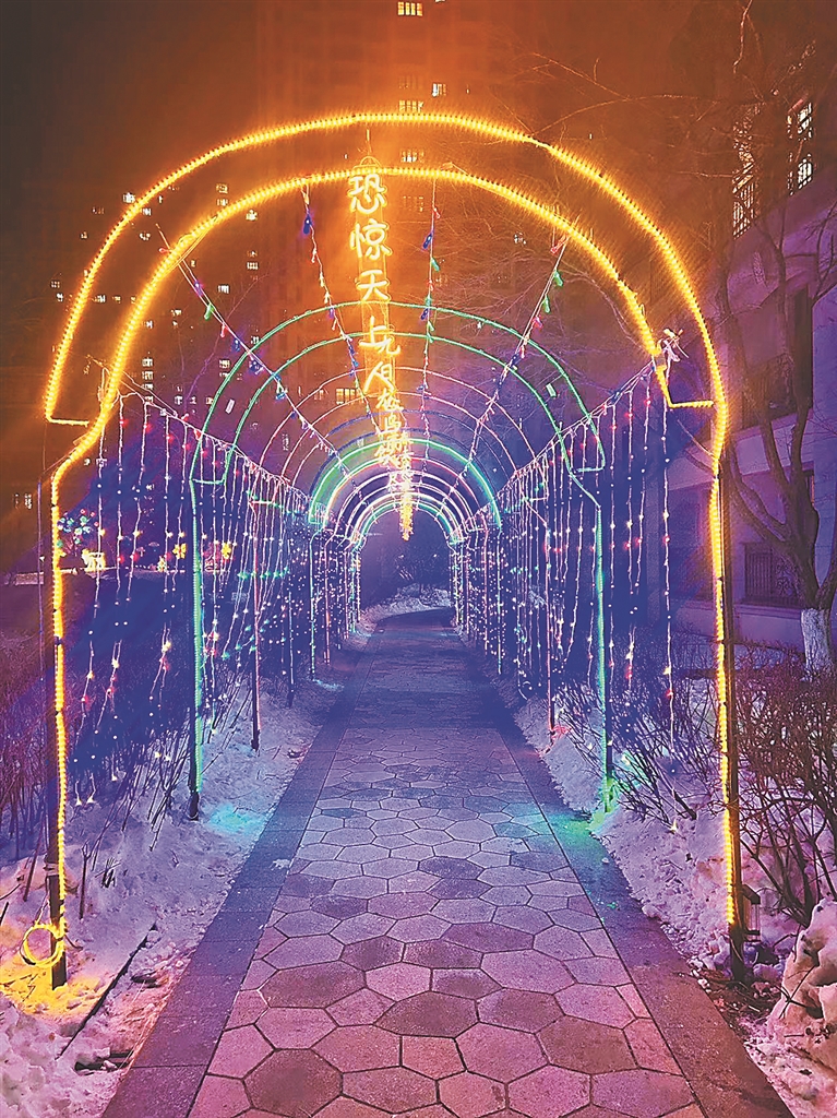 近日,记者白天在该小区的广场看到,一个高约3米,戴着红帽子、红围脖,身上有红色爱心和蓝色雪花点缀的大雪人格外引人注目,不少居民在此拍照打卡。到了晚上,小区里的彩虹长廊仿佛点点繁星坠地;绿植上的满天星迷你灯一闪一闪,宛如夏夜里的萤火虫;团圆灯、心形灯、月亮灯以及一系列五光十色的贺岁造型,营造出浓浓的年味。