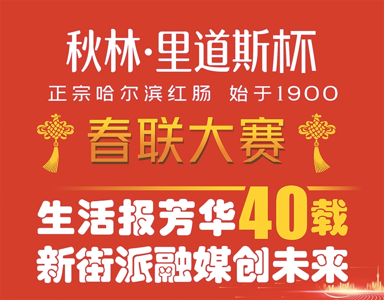 记者了解到,由生活报社和哈尔滨秋林里道斯食品有限责任公司主办的“秋林·里道斯杯春联大赛”,自2日在生活报微信公众号发布征集消息后,一大批构思精妙的应征作品纷纷发至生活报微信公众号。不到一周时间,已征集到来自全国各地的千余件春联作品。投稿者不仅有包括我省42 个市、县、区的热心读者,还有来自北京、上海、江苏、福建、安徽、辽宁等全国各地的网友,有人一次提交了10件春联作品,年龄最大的投稿者90岁……这些极具传统意蕴又富时代内涵的春联佳作,推动中华优秀传统文化薪火相传,文末附有获奖作品和入围作品,快来看看有没有你的作品吧!